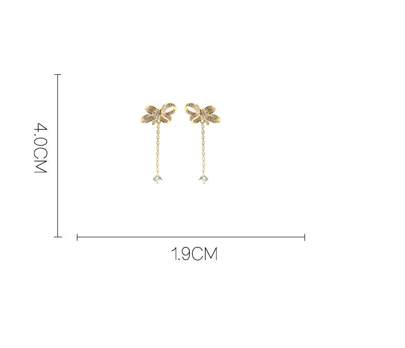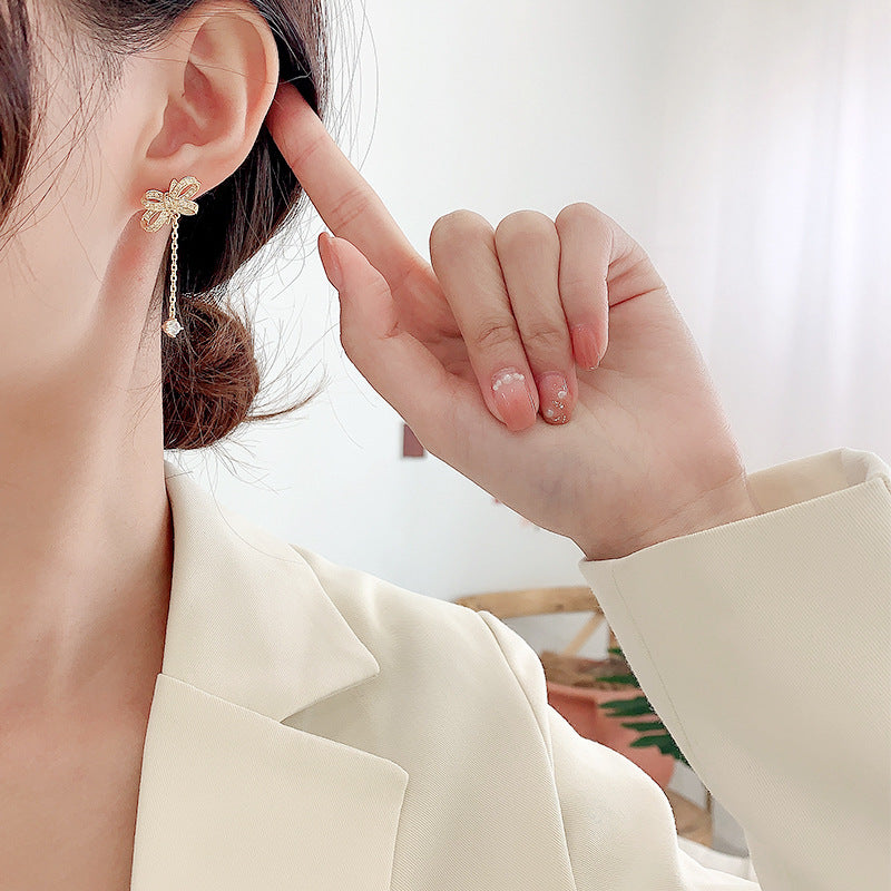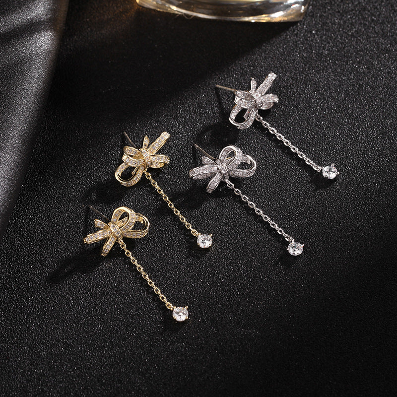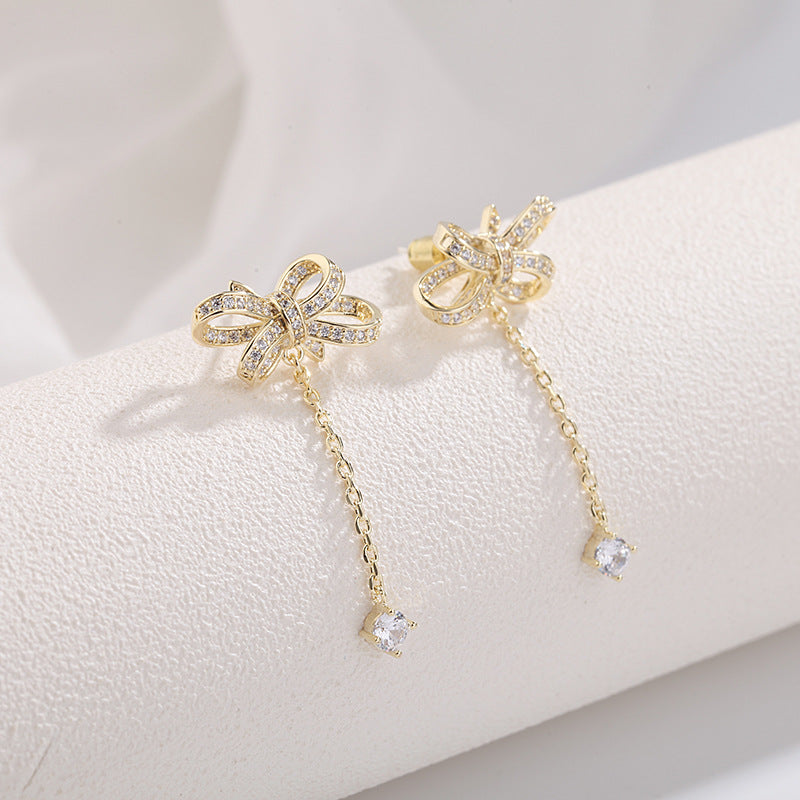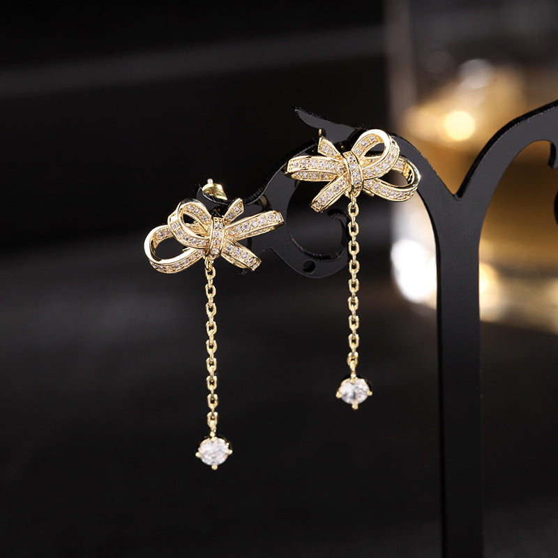 A delicate bow meets a lightweight dangling chain — the perfect blend of feminine charm and graceful sparkle.