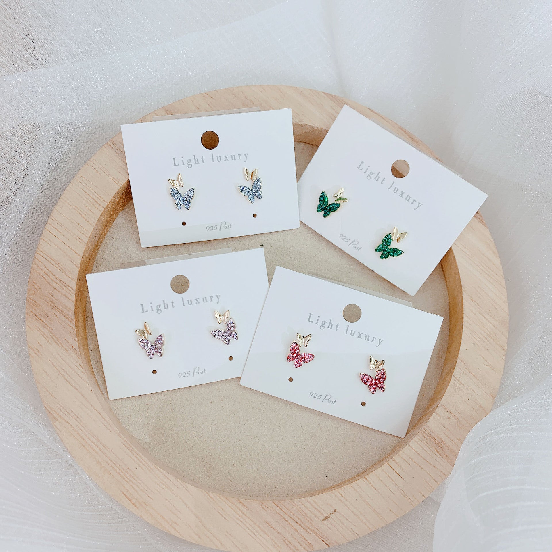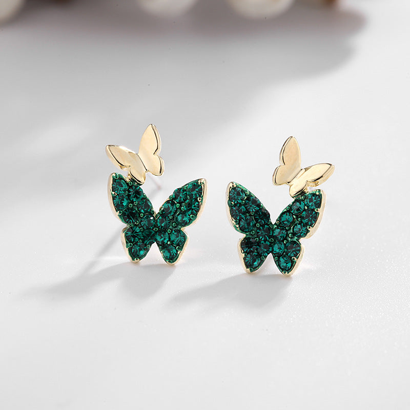 Delicately crafted with two butterflies in different sizes, these earrings shimmer with rhinestone accents on a golden base. The layered butterfly design creates a lively, elegant effect that catches the light beautifully.