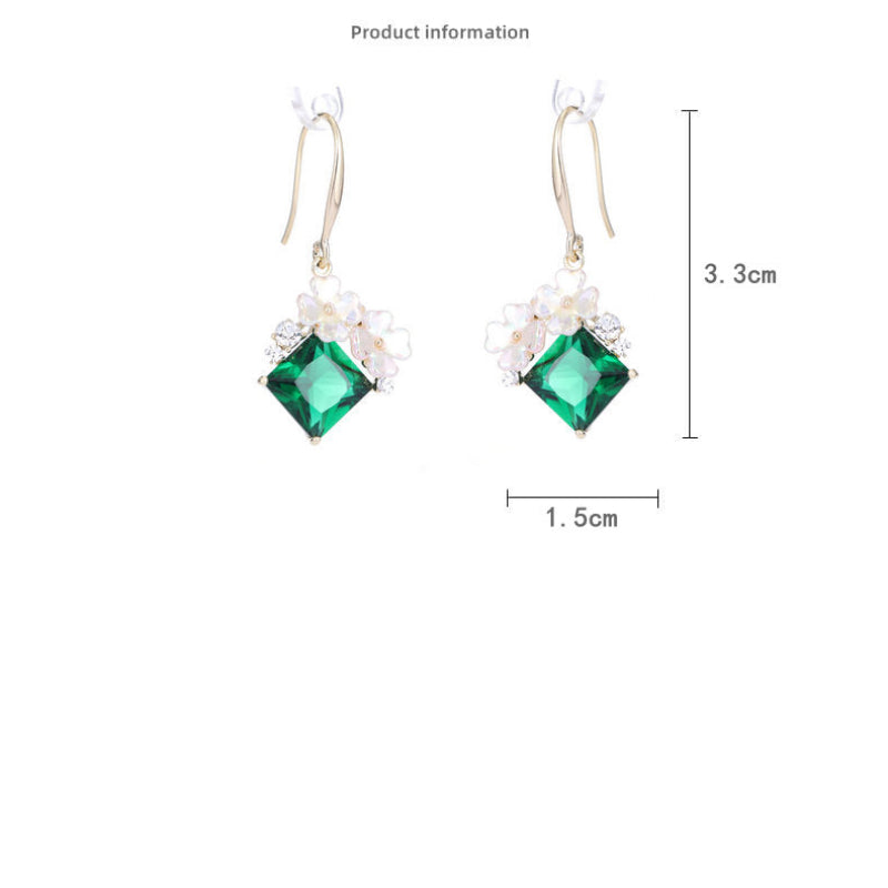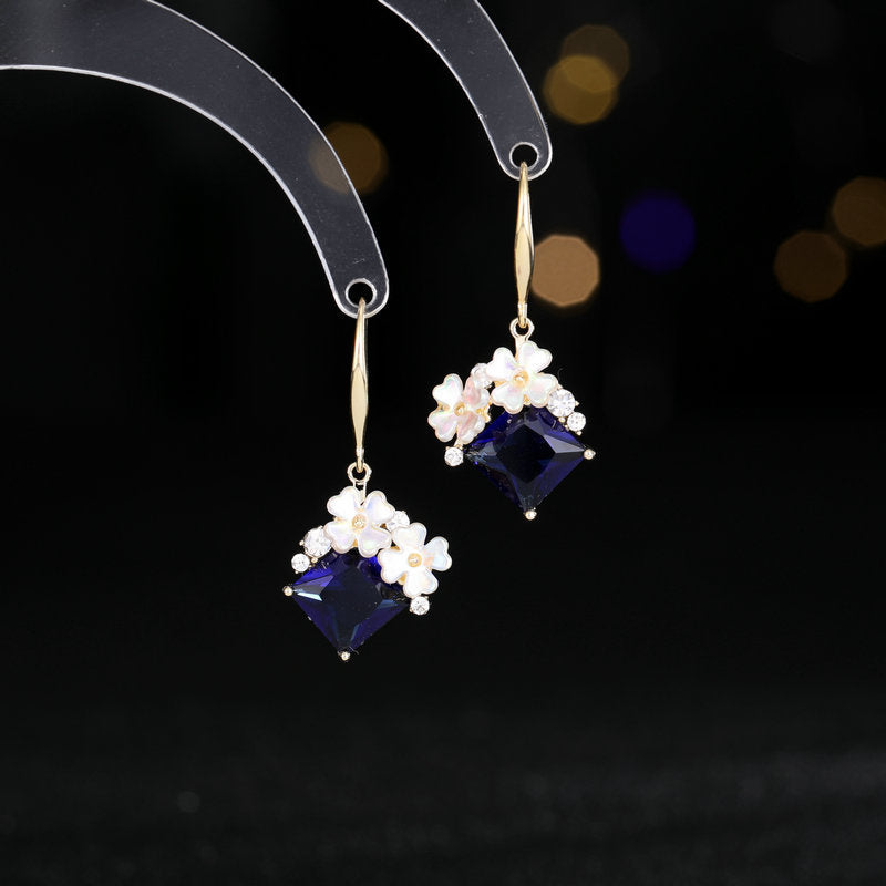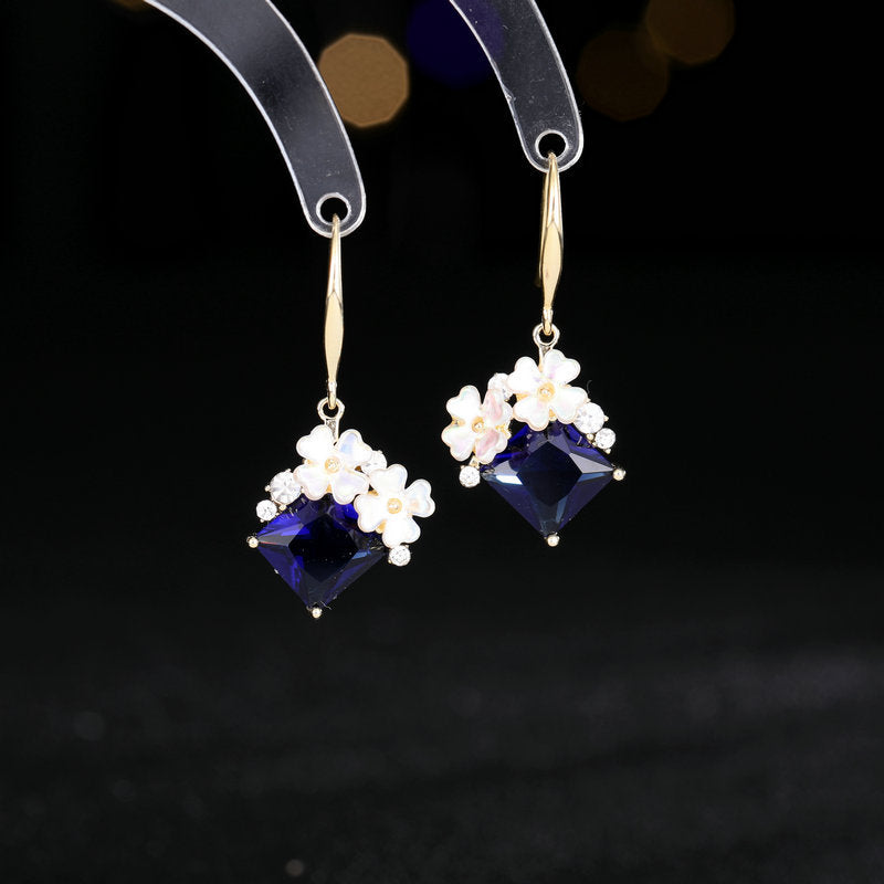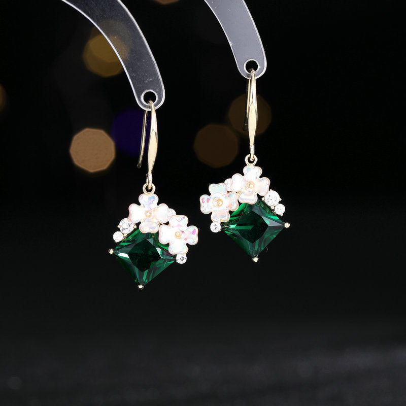 Korvakorun pohjassa sädehtii syvävärinen neliönmuotoinen zirkoni, jota koristaa käsin asetellut pienet kukat — herkkä ja ylellinen yhdistelmä.