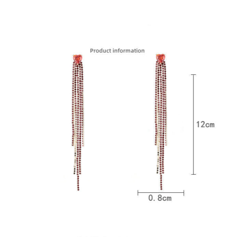 Sparkling red heart-shaped stones meet cascading chain tassels for a dramatic, luxurious look that sways with your every move.